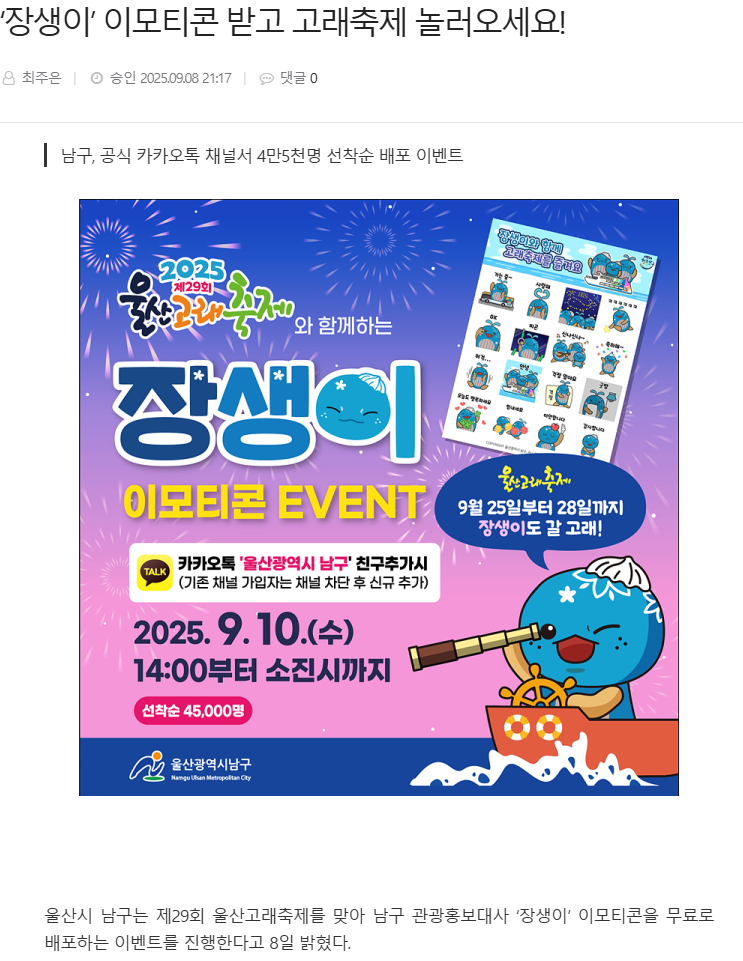 ‘장생이’ 이모티콘 받고 고래축제 놀러오세요! - 울산제일일보