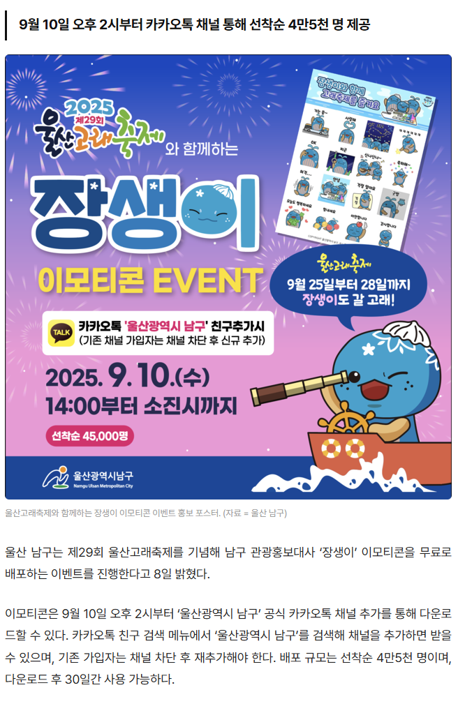 울산 남구, 고래축제 맞아 관광홍보대사 ‘장생이’ 이모티콘 무료 배포 - 브릿지경제