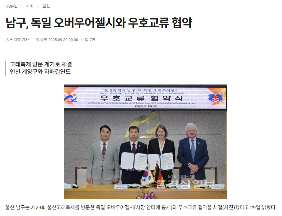 남구, 독일 오버우어젤시와 우호교류 협약 < 울산 < 사회 < 기사본문 - 경상일보