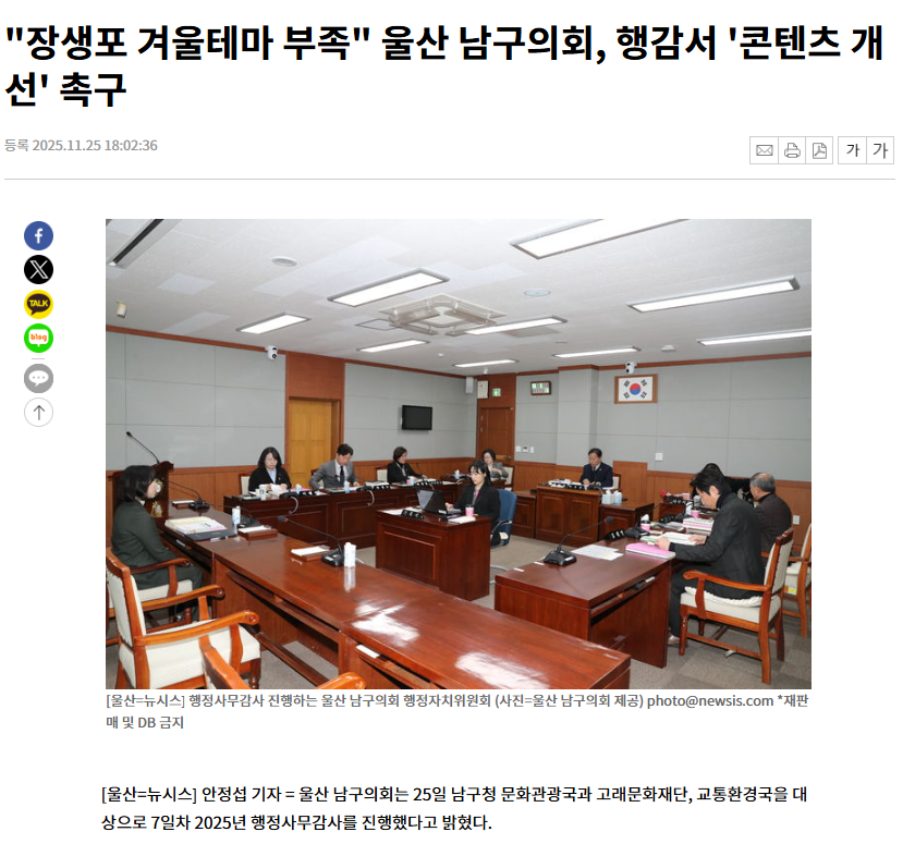 "장생포 겨울테마 부족" 울산 남구의회, 행감서 '콘텐츠 개선' 촉구 :: 공감언론 뉴시스 ::