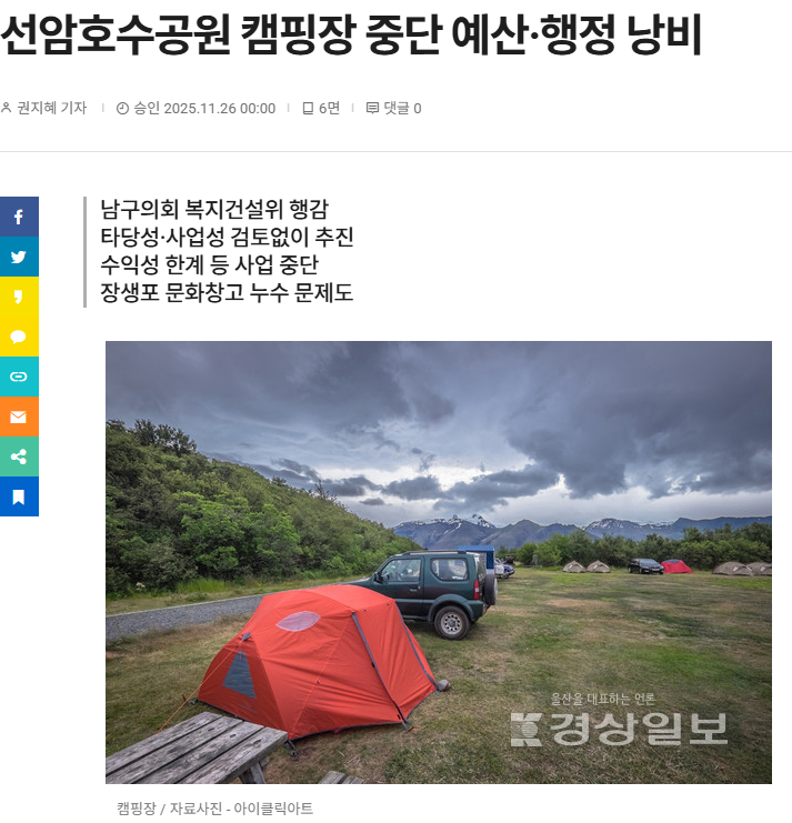 선암호수공원 캠핑장 중단 예산·행정 낭비 < 울산 < 사회 < 기사본문 - 경상일보