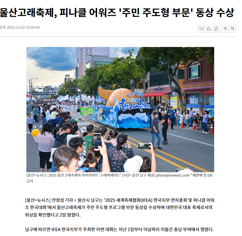 울산고래축제, 피나클 어워즈 '주민 주도형 부문' 동상 수상 :: 공감언론 뉴시스 ::