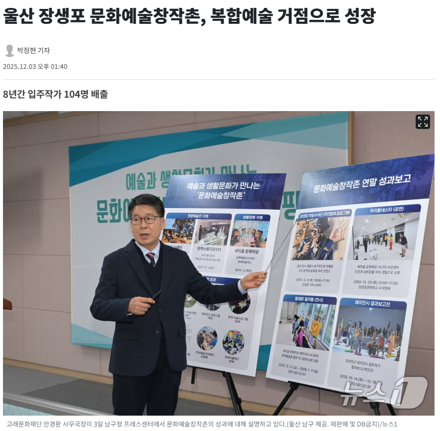 (울산=뉴스1) 박정현 기자 = 울산 고래문화재단 문화예술창작촌이 문학·미술·생활문화를 아우르는 지역 복합예술 거점으로 자리매김했다고 3일 남구가 밝혔다.