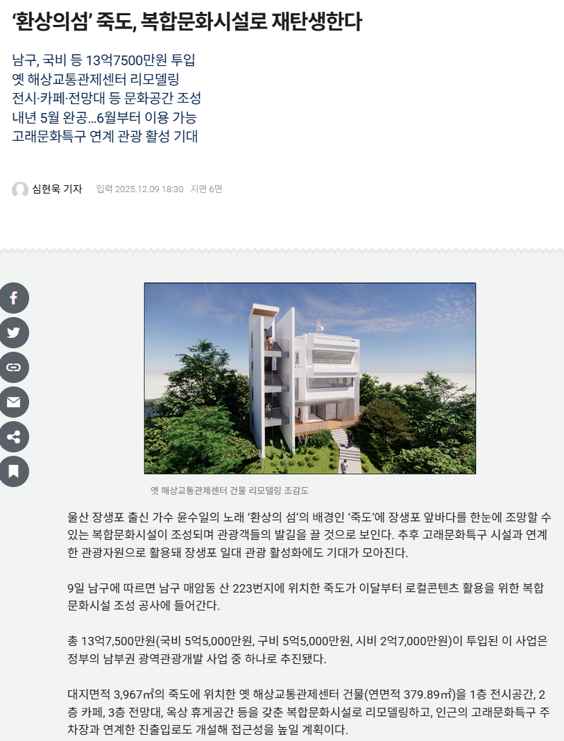 ‘환상의섬’ 죽도, 복합문화시설로 재탄생한다 < 사회일반 < 사회 < 뉴스 < 기사본문 - 울산매일 - 울산최초, 최고의 조간신문