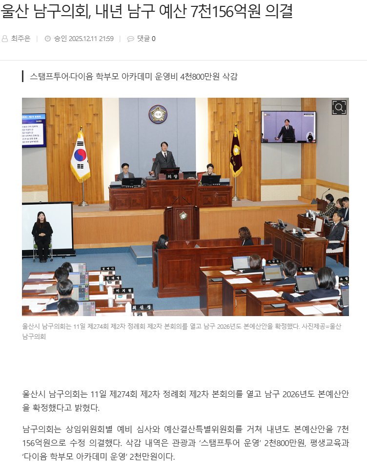 울산 남구의회, 내년 남구 예산 7천156억원 의결 - 울산제일일보