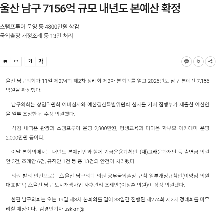 울산 남구 7156억 규모 내년도 본예산 확정 < 일반 < 사회 < 기사본문 - 울산신문