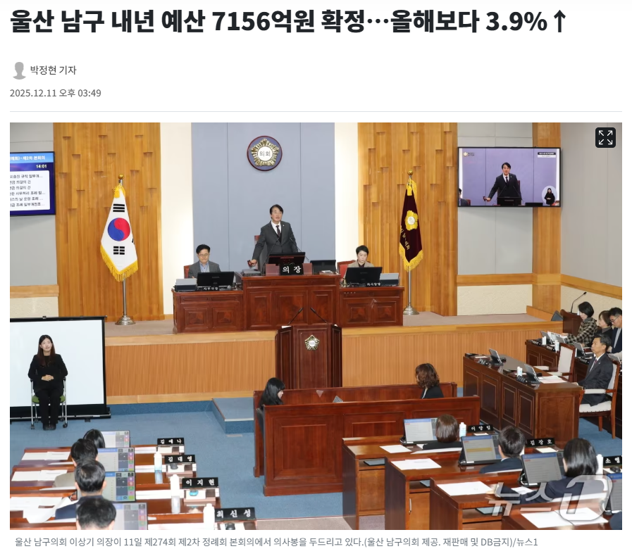 울산 남구 내년 예산 7156억원 확정…올해보다 3.9%↑ - 뉴스1