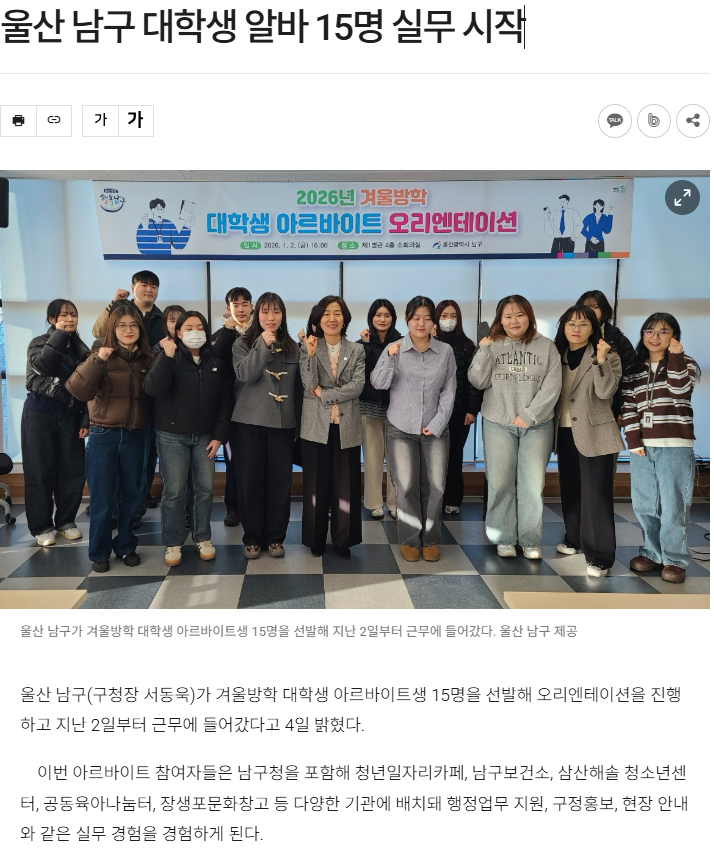 울산 남구 대학생 알바 15명 실무 시작 < 일반 < 사람들 < 기사본문 - 울산신문