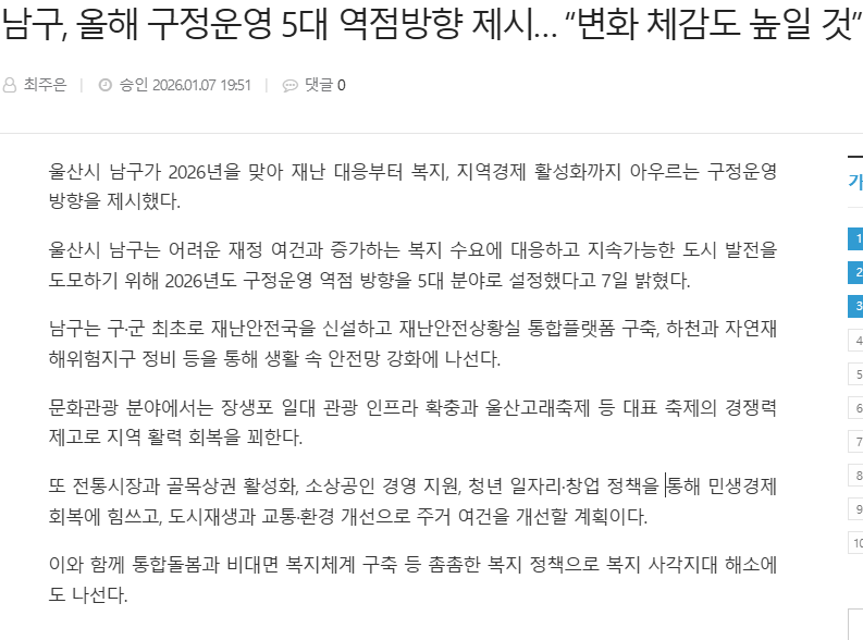 남구, 올해 구정운영 5대 역점방향 제시… “변화 체감도 높일 것” - 울산제일일보