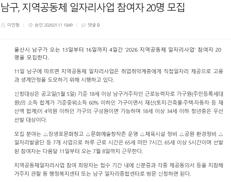 남구, 지역공동체 일자리사업 참여자 20명 모집 - 울산제일일보