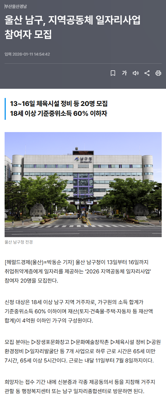 울산 남구, 지역공동체 일자리사업 참여자 모집 - 헤럴드경제