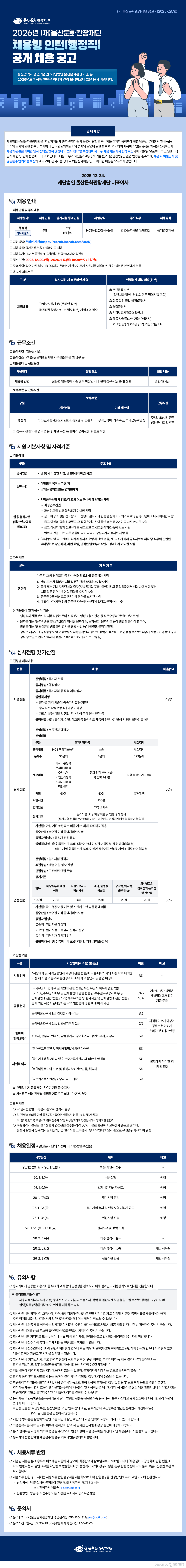 울산광역시 출연기관인 「재단법인 울산문화관광재단」은 2026년도 채용형 인턴을 아래와 같이 모집하오니 많은 응시 바랍니다.