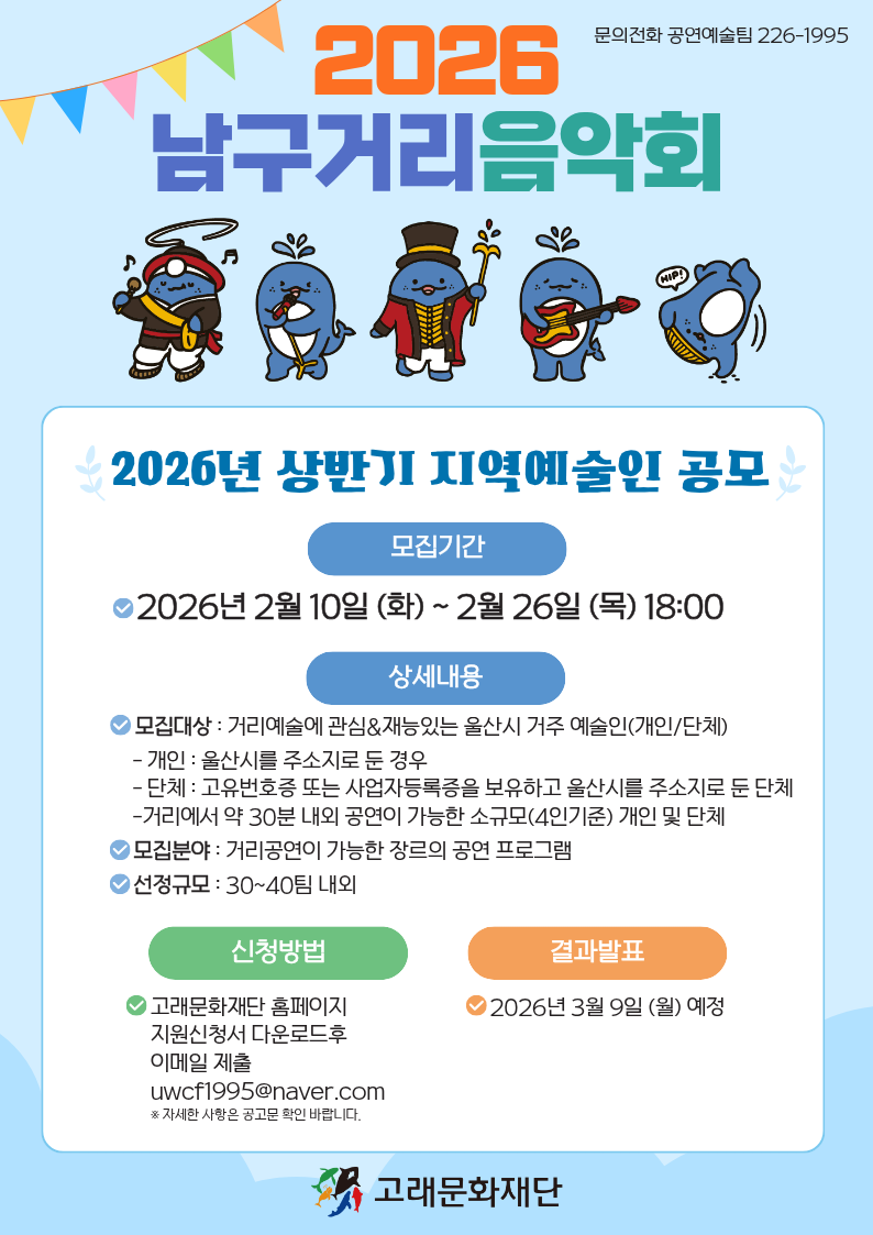 (재)고래문화재단에서는 2026 '남구 거리음악회'와 함께 할 출연진을 다음과 같이 공개 모집하오니,