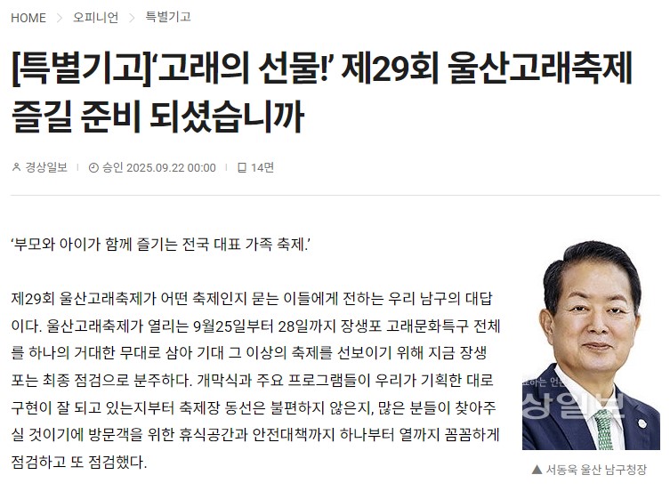 [특별기고]‘고래의 선물!’ 제29회 울산고래축제 즐길 준비 되셨습니까 < 사외칼럼 < 특별기고 < 오피니언 < 기사본문 - 경상일보