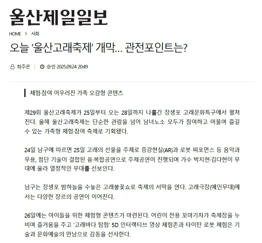 오늘 ‘울산고래축제’ 개막… 관전포인트는? - 울산제일일보 울산제일일보 최주은 기자