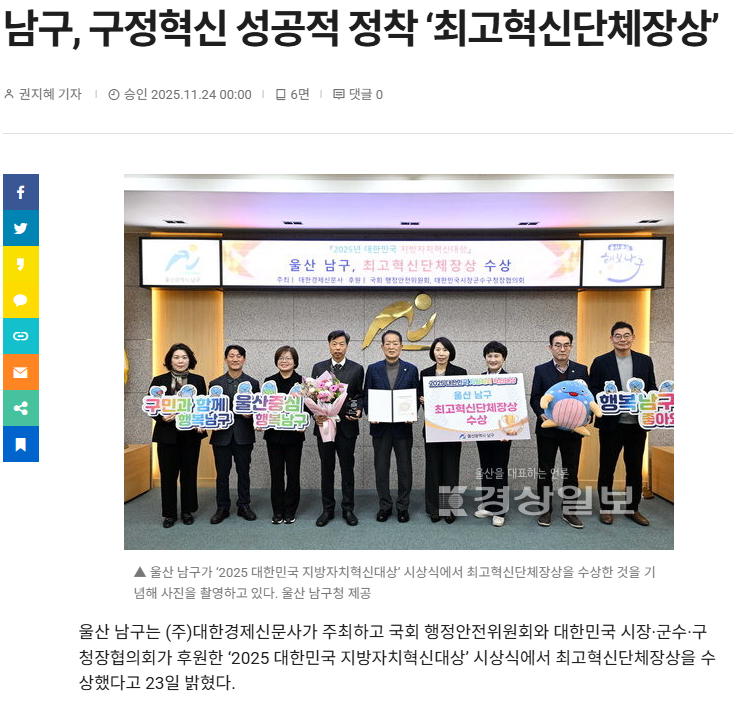 남구, 구정혁신 성공적 정착 ‘최고혁신단체장상’ < 울산 < 사회 < 기사본문 - 경상일보