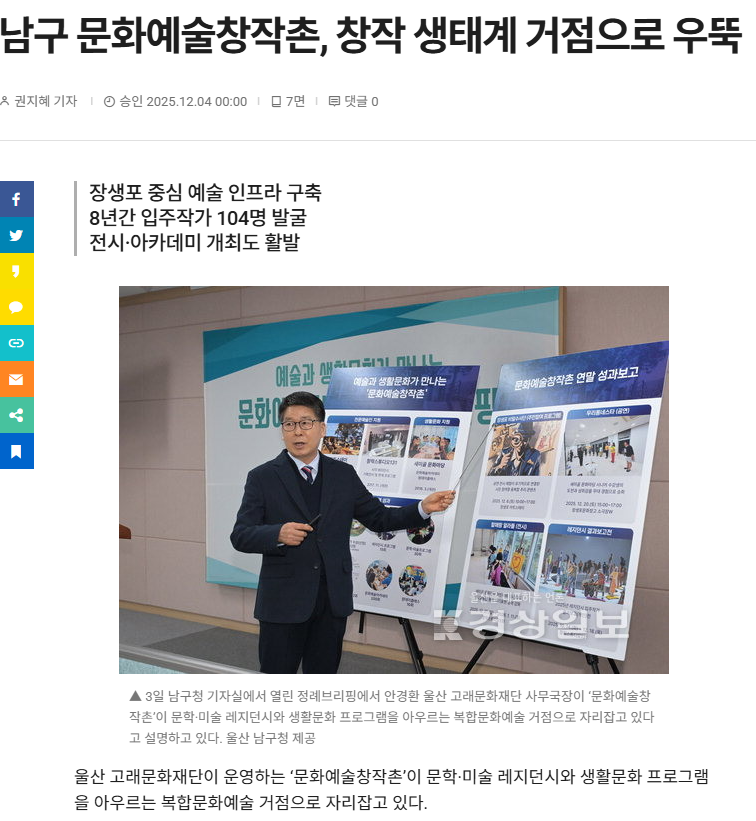 남구 문화예술창작촌, 창작 생태계 거점으로 우뚝 < 울산 < 사회 < 기사본문 - 경상일보