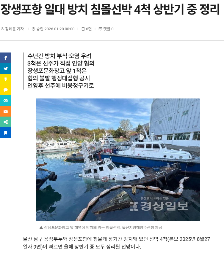 장생포항 일대 방치 침몰선박 4척 상반기 중 정리 < 울산 < 사회 < 기사본문 - 경상일보