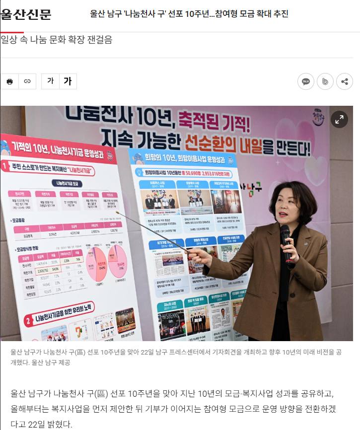 울산 남구 '나눔천사 구' 선포 10주년…참여형 모금 확대 추진 < 일반 < 사회 < 기사본문 - 울산신문
