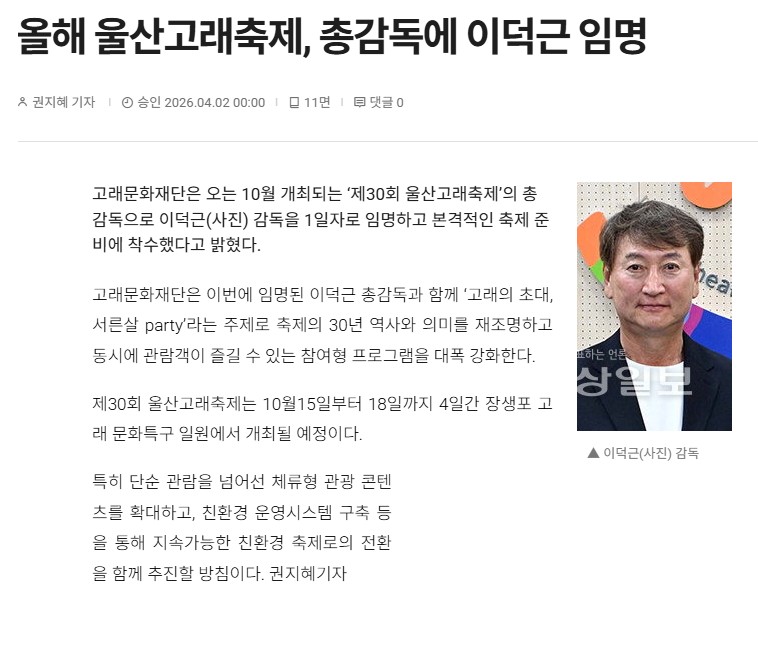 올해 울산고래축제, 총감독에 이덕근 임명 < 종합 < 문화 < 기사본문 - 경상일보