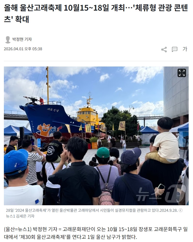 올해 울산고래축제 10월15~18일 개최…'체류형 관광 콘텐츠' 확대 - 뉴스1
