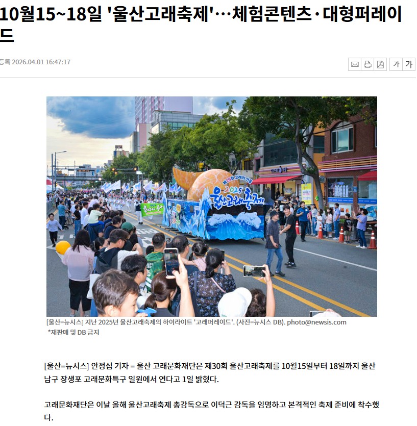 10월15~18일 '울산고래축제'…체험콘텐츠·대형퍼레이드 :: 공감언론 뉴시스 ::