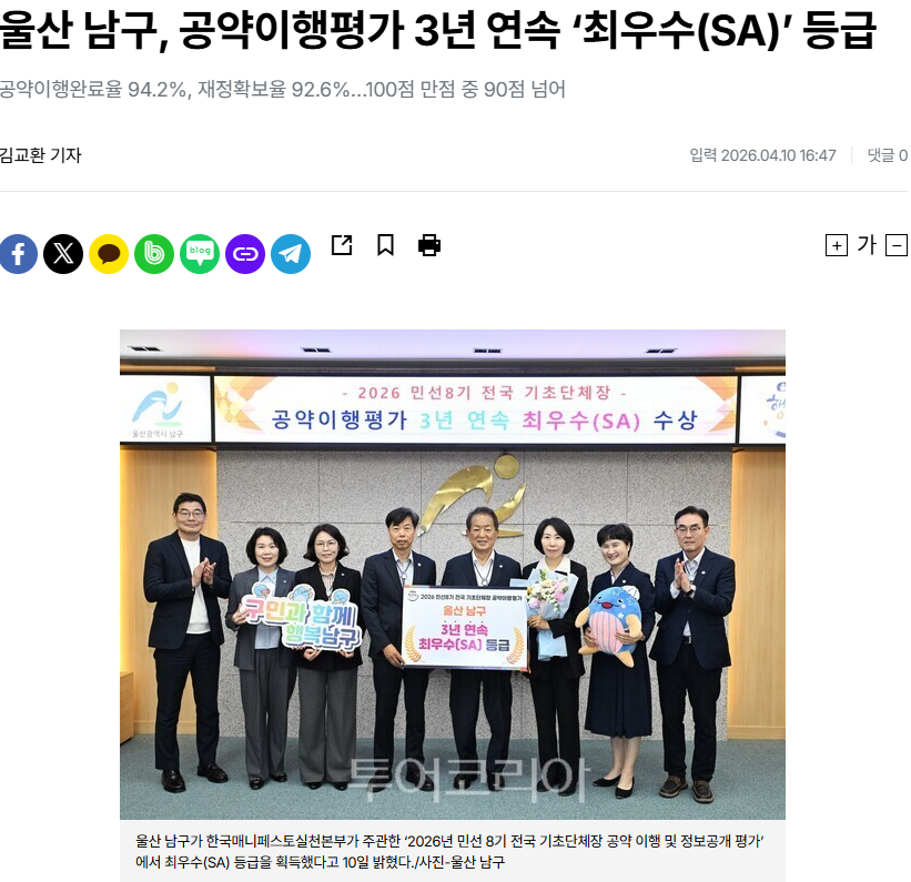 울산 남구, 공약이행평가 3년 연속 ‘최우수(SA)’ 등급 < 부산/울산/경남 < 전국 < 기사본문 - 투어코리아